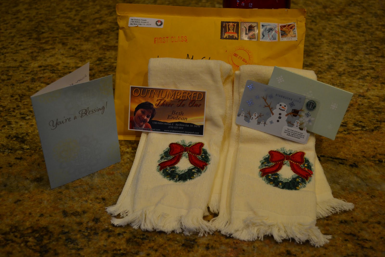 I won a giveaway @ Beth's blog and received my Starbucks card! Beth also sent some adorable Christmas tea towels and such a sweet note! Thank you Beth for bringing JOY to my day!!